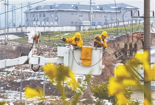 2月24日,田间地头的白雪尚未融化,油菜花却已悄然开放。国家电网洪江市供电公司工作人员在黔城镇双溪社区对10千伏岩垅线016号杆带电解除引流线,确保线路正常供电。 胡浩 摄