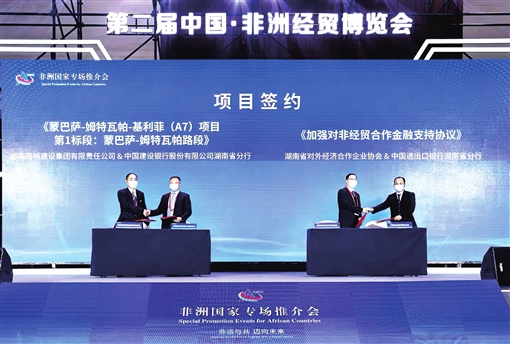 自中非博览会永久落户湖南,湖南建行一直以金融科技为引擎,驱动中非经贸、产能合作。2017年以来,该行投入2000多万元,与湖南省商务厅共同打造了“湘企出海+”综合服务平台、“湖南招商云”两大平台,为中非经贸提供政策咨询、项目获取、金融支持等在内的各类服务,被湖南省政府誉为“湖南开放崛起新名片”“湖南招商引资新名片”。近三年来,湖南建行累计为湖南企业“走出去”提供融资约25亿美元,为非洲12个国家的16个基础设施建设项目提供跨境担保约27亿元,并与省内多家重点“走出去”核心企业签订跨境金融合作、海外发债及海外项目融资协议。