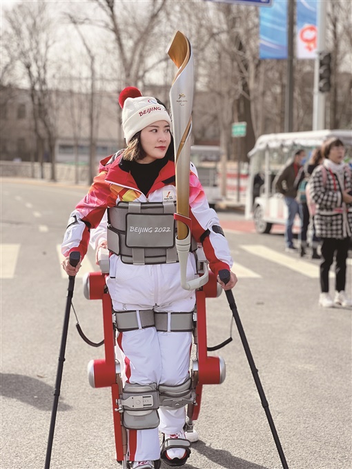 上午10时许,见证奇迹的时刻到来!当上一棒火炬手来到杨淑亭面前时,只见杨淑亭借助外骨骼机器人,从坐凳上“站”起来,点火,击掌,完成火炬交接。随后杨淑亭将火炬固定在胸前的插杆上,辅以两根拐杖,迈出第一步,此时,周围爆发出热烈的欢呼声。杨淑亭倾尽身体所有的力量努力保持平衡,在外骨骼机器人助力下,一步一步向前“走”去,掌声、“加油”声持续不断。100米的距离对她来说,太不容易!终于“走”到下一个火炬交接点,结束点火交接仪式后,这个坚强的女孩绽放笑容,定格冬残奥会火炬传递最美的时刻,诠释出残疾人不向命运屈服的顽强精神。杨淑亭激动地说:“‘站’起来那刻,感觉有股力量来自祖国!”