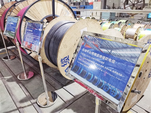 新能源汽车充电桩、风力发电电缆……衡变公司、金杯电工、恒飞电缆的产品展示厅内,应用于新能源领域的产品,占了一半以上。