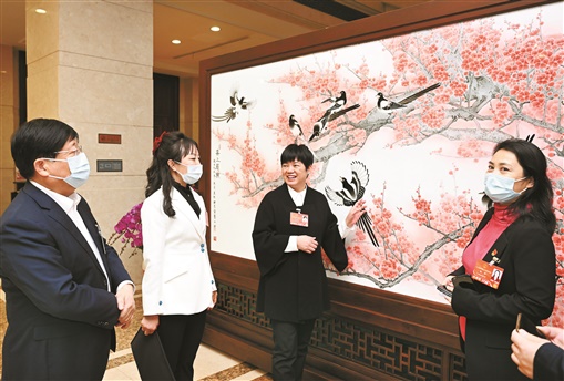 在十三届全国人大五次会议湖南代表团驻地大堂,摆放着一幅大型双面瓷板画,一面叫《喜上眉梢》,另一面叫《金玉满堂》,大气的构图、精巧的设计,吸引了许多代表的目光。