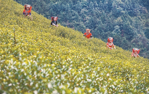 3月7日,江华瑶族自治县桥市乡将军冲村,茶农在采摘春茶。当天,该县茶园第一批春茶开始采摘,茶农抢抓农时采摘春茶,供应市场。