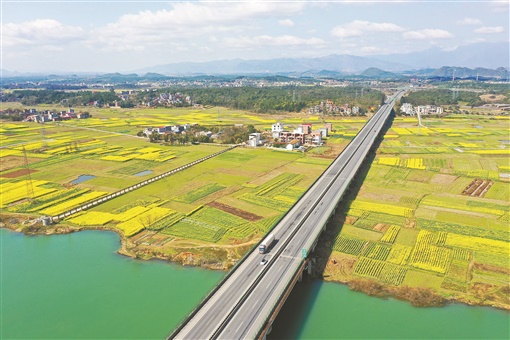 3月7日,厦蓉高速道县潇水大桥段,油菜花海宛如金毯铺地,与河流、村庄构成一幅美丽的田园画卷。何红福 摄