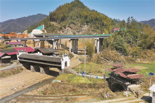 3月8日,安化县柘溪镇双桥村,建于不同时期的两座风雨桥与建设中的马(迹塘)安(化)高速和官(庄)新(化)高速互通枢纽“同框”。风雨桥是当地人们生活出行的重要交通设施,曾经见证了茶马古道的繁荣,如今又见证了高速公路修进山区。湖南日报全媒体记者 郭立亮 摄