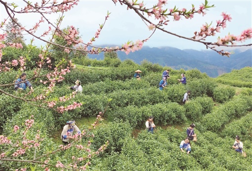 3月17日,保靖县葫芦镇大岩村黄金茶园,村民趁着晴好天气采摘明前春茶。春回大地,正是春茶采摘的好时节。在湘西地区黄金茶的核心主产区,茶农趁着晴好天气抢摘春茶,供应市场。