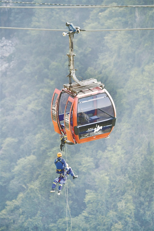 4月8日,参加应急救援演习的救援人员在“被困缆车”处营救“被困人员”。当天,张家界天门山景区举行索道应急救护联合演习,旨在增强工作人员在突发事件中的应变处置能力,掌握急救的常规程序和方法。
