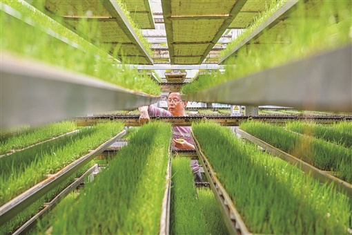 4月11日,宁乡市双江口镇智慧农业育秧工厂,湖南极和智慧农业科技有限公司技术人员夏承志在查看秧苗的生长情况。 湖南日报全媒体记者 郭立亮 摄