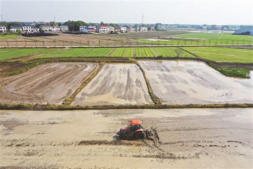 4月11日,宁乡市金洲镇箭楼村育秧基地,农民驾驶农机在田间开展春耕备耕工作。湖南日报全媒体记者 郭立亮 摄