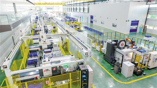 数十条高如楼房的红色机械臂一字排开,整齐划一地高举长臂。“咚”地一声巨响,大块钣金被重重压入模具,变幻成新的模样。