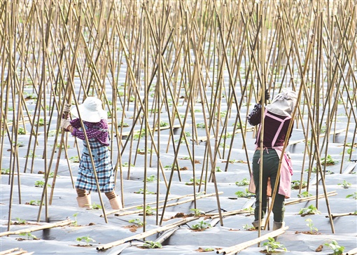 4月26日,嘉禾县龙潭镇龙兴村,村民在蔬菜基地劳作。今年,该村建起千亩蔬菜基地,种植冬瓜、茄子、辣椒等农产品,促进农业增效、农民增收。黄春涛 摄