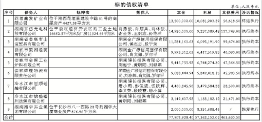 本次拟处置的资产为花垣鑫发矿业有限公司等9户债权(以下简称“标的债权”)。截至2022年2月20日(处置基准日),标的债权总额合计13,572.88万元,其中:本金余额7,790.29万元,利息5,736.22万元,其他费用46.37万元。