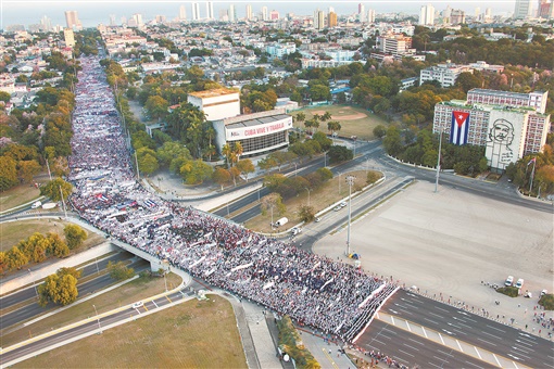 古巴多地5月1日举行“五一”国际劳动节集会游行,上百万民众走上街头,反对美国对古封锁,表达爱国情感,并向古巴医疗工作者和科研人员致敬。图为当日,古巴民众在哈瓦那参加集会游行。