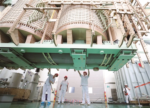 5月9日,特变电工衡阳变压器有限公司装配车间工人正在进行总装作业。该公司承接了闽粤联网工程13台换流变的研制任务,公司实现满负荷生产,确保产品及时交付。
