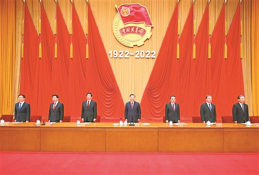 人民大会堂二层宴会厅气氛隆重热烈。主席台上方悬挂着“庆祝中国共产主义青年团成立100周年大会”会标,后幕正中悬挂团徽,团徽下方是“1922-2022”字标,10面红旗分列两侧。