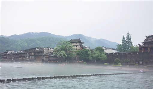 4月27日中午,细雨中的古城沱江上薄雾弥漫。这条流淌着故事的河流,将苗乡文化和风土人情传承千载,也见证着古城市井风情。