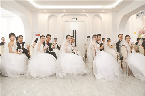 智轨为婚车,科技感十足。当日9时许,身穿西服和婚纱的50对新人乘坐智轨进入株洲时光里艺术中心。