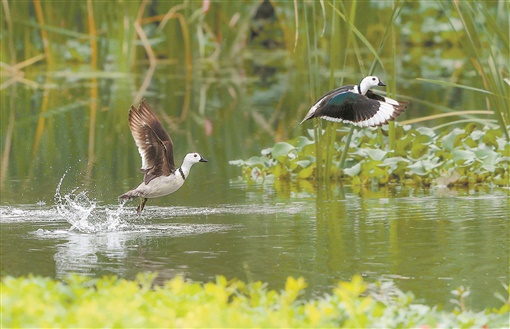 5月20日,长沙洋湖国家湿地公园,国家二级重点保护野生动物棉凫踏波飞行。 棉凫是世界上最小的鸭子,一般生活在河川、湖泊、池塘和沼泽地,在树洞中筑巢。飞行时,雄鸟双翼呈绿色并有白带,雌鸟羽色较淡。此次在洋湖共发现5只棉凫。