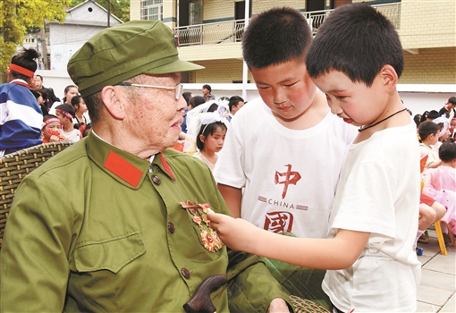 5月30日,吉首市马颈坳镇白岩村,彭官荣老人的军功章吸引了学生。当天,该市关工委与市退役军人事务局联合开展“红心颂党恩 喜迎二十大”庆“六一”主题活动,90岁的彭官荣为孩子们讲述自己参加抗美援朝的战斗经历和体会。