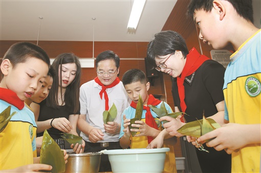 5月31日,长沙师范附属天健小学,师生们在一起包粽子。当天,该校举行庆“六一”游艺会,组织了美发、包粽子、绘彩盆、叠衣服等近20个体验项目,让孩子们在劳动中体会快乐、茁壮成长。 湖南日报全媒体记者 田超 摄