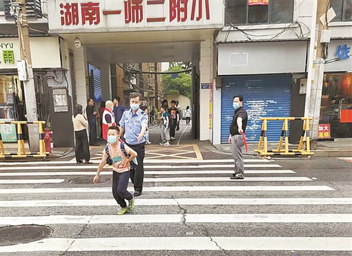 开福区湖南一师二附小的大门正对着蔡锷路。蔡锷路虽窄但车流量大,有7条线路的公交车经过。5月28日下午,记者在这里看到,从16时30分开始,便陆陆续续有学生从学校出来。校门外,一名交警、一名保安及两名家长志愿者早已“排兵布阵”,分别站在马路两边。只要有学生过来,交警便示意过往车辆停下,和保安、家长志愿者一道护送学生横过马路。