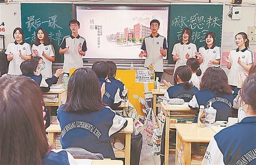 6月2日,距高考仅5天时间,长沙市麓山滨江实验学校高三G1911班教室里,学生在上高中“最后一课”。通过视频回味一起走过的日子、学生签名赠与母校大奖状、举办青春励志“迷你音乐会”等,45位同学为高中画上了圆满句号。