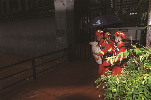 图为消防救援人员在凤凰县沱江镇凤凰南路小憩公园公寓楼入口处,背扶老人和怀抱三个月大的婴儿脱离险境,在该公寓内共计解救被困老幼19人。