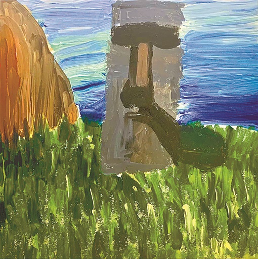 这幅油画,明明画绿草丛中矗立的大山,小保罗却在山上横画一杠,说是墨镜;竖涂两笔,说是美国人的高鼻梁;再撸一烟嘴,伸出山外,我认真地问他:“怎么想到要这样画?”他摇头回答:“没想法呀,好玩呗。”