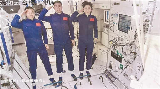 6月5日20时50分,航天员陈冬、刘洋、蔡旭哲依次全部进入天和核心舱。图为在北京航天飞行控制中心拍摄的进驻天和核心舱的航天员陈冬(中)、刘洋(右)、蔡旭哲向全国人民敬礼。