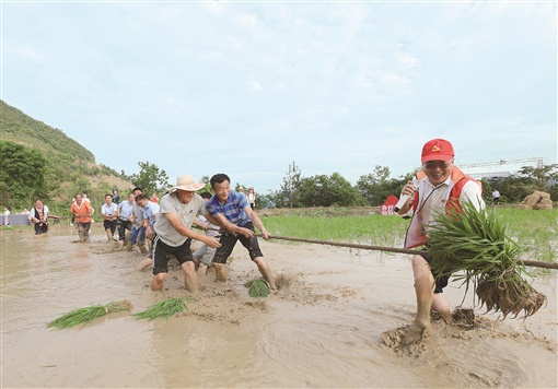 6月6日,居民和游客一起参与拔河。当天,在张家界武陵源景区天子山峰林之巅的“空中田园”,当地居民和游客在泥水中拔河、插秧、抢鸭子,共同感受民俗文化,体验农旅融合乐趣。吴勇兵 摄