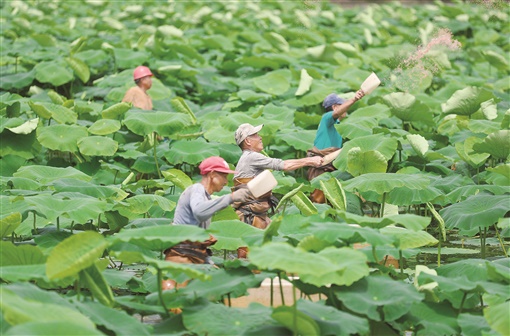 6月6日是芒种节气,各地农民抢农时、忙耕作,田间地头呈现一派忙碌景象。图为当日,农民在浙江省湖州市德清县钟管镇一处藕田中施肥。