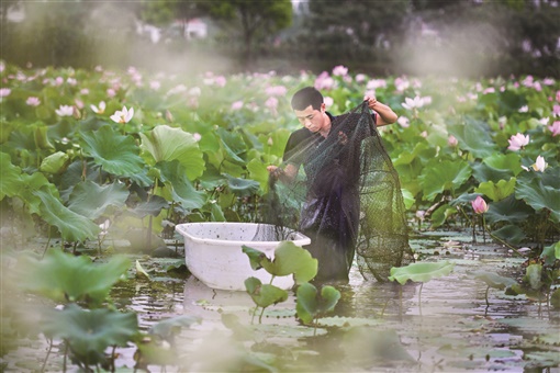 6月9日清晨,临湘市江南镇谷花社区长旺片,村民在种养基地里收笼取虾。目前,该镇共有立体种养模式农田4万余亩,年产值达2亿元。湖南日报全媒体记者 郭立亮 通讯员 张子龙 摄影报道