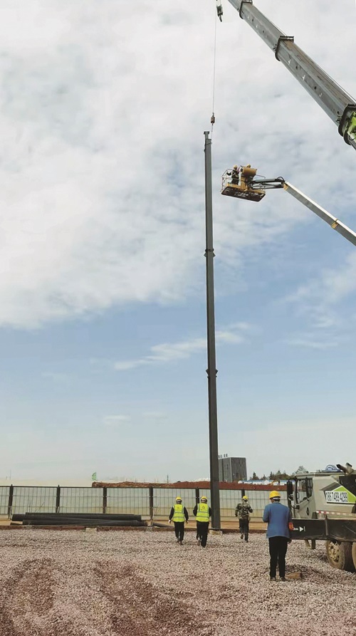 项目团队针对不同区域的吊装难点,提前科学组织、分类施策、现场指挥,逐一完成吊装任务:钢柱吊装采用斜吊法及旋转法相结合单根整体吊装,起重机边回转边起钩,使钢柱绕柱脚旋转而直立,立钢柱时,先将钢柱脚螺栓孔插入预留螺栓,回转吊臂,使钢柱头大致垂直后初步对中,即对螺栓进行初拧;钢屋架现场拼装、吊装采用单榀吊装,双机抬吊一次成型,单榀吊装,吊点采用四点绑扎,两台50吨汽车吊同时起吊,现场专人同步指挥;彩钢板安装则采用架设空中斜钢索的运输方案,用绞磨把面板运至屋面,采用瓦楞组装,顺屋面坡度方向依次安装。