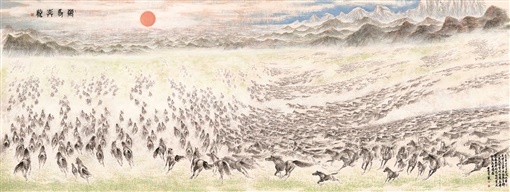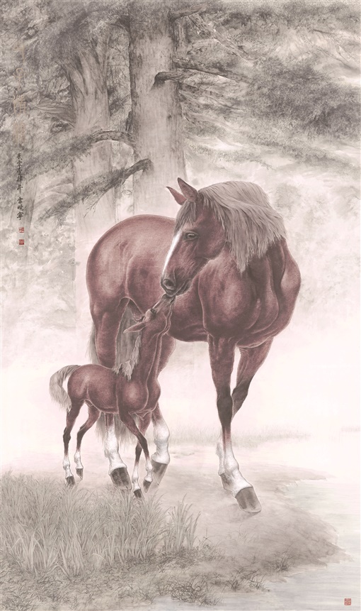 作品《父子情深》,旨在表现父子之间的情感,作品中的骏马是一种被借用的符号。那匹小马伸脖张嘴去亲吻大马的细节瞬间,构成了作品中的“画眼”,使作品充满了人情况味。骏马身后,几棵挺拔的葱郁树木,马脚下一大片茂盛的草蓬,天空弥漫着乳白色雾霭,这不禁让我们想起元人汤采真所云:“山水之为物,禀造化之秀,阴阳晦冥,晴雨寒暑,朝昏昼夜,随形改步,有无穷之趣,自非胸中之壑,汪汪洋洋,如万顷波,未易摹写。”画家把山水元素植入画中,花花木木,牵绊勾连,画工画形,绘工赋色,让观者仿佛置身于山水之前,在天地之间神游梦回,颇有“天人合一”之境。这幅画既有工笔画的双钩,也有随类赋彩,体现了画家极强的色彩驾驭能力。其笔下之马,已经超越中国画的传统格局和审美规范。