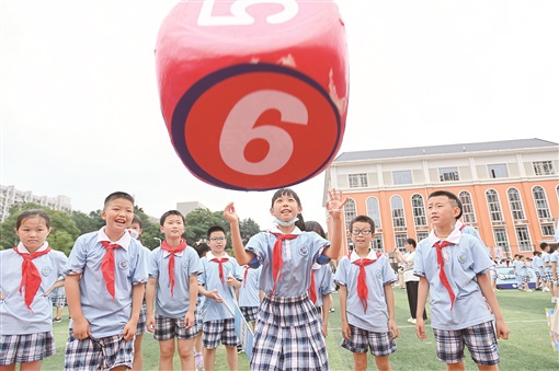 6月9日,学生在操场上体验数字游戏。当天,长沙市天心区仰天湖桂花坪小学开展数学嘉年华活动,让学生在轻松的游戏活动中发现数学之美,感受数学魅力。