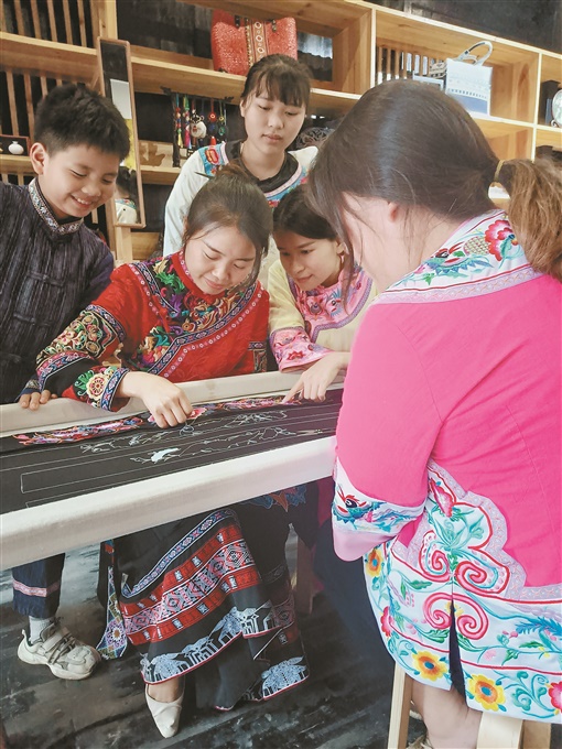 6月15日,泸溪县浦市古镇,绣娘按照设计方案制作苗绣文创产品。去年以来,湖南师范大学工程与设计学院开展送技能下乡活动,通过传统苗绣挑花与创新设计融合,生产销售文创产品,助力当地农村妇女在家门口就业增收。 陈岭 陈翔 摄影报道