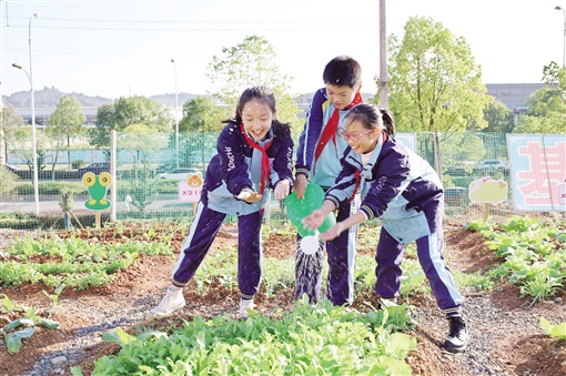 “校长有一丘示范田,班级有一个劳技辅导员,由家长或老师担任。”小学部校长杨城花说,既落实“双减”,还增加劳动实践,学生开心,家长放心,老师舒心。