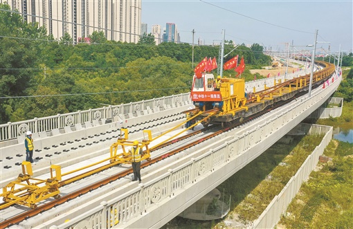 6月16日,常益长高铁常德站建设施工现场,随着中铁十一局的铁路建设者们把首对500米长钢轨铺设至无砟轨道道床上,常益长铁路常益段正式进入铺轨阶段。