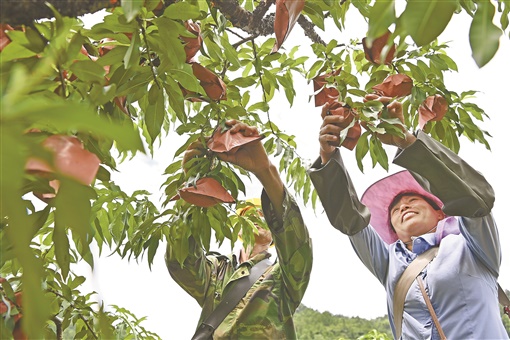 6月15日,炎陵县霞阳镇石子坝村黄桃种植基地,果农忙着采摘早熟的黄桃供应市场。该村村民利用海拔低的地理优势,通过改良品种,种植的黄桃比该县其他地区提前约1个月成熟上市,赢得了市场先机和效益。 湖南日报全媒体记者 李健 摄