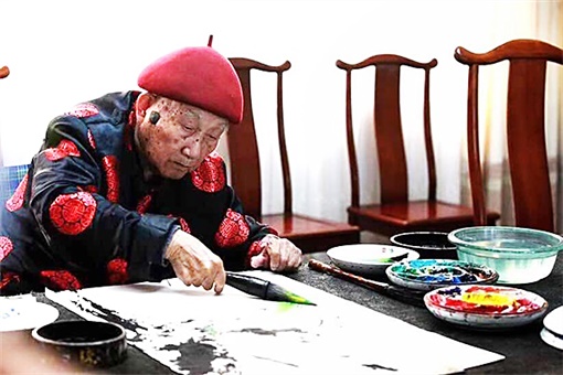 易图境身着红色唐装出席开幕式,言语间非常高兴。老先生带着乡音表示,画画是没有止境的,百岁老人不算老。如果以后还能创作,会以“百岁老人不算老”作为落款。
