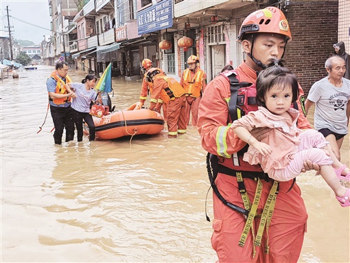 上图 6月21日,江永县上江圩镇上江圩社区,消防员和民警在转移被困群众。