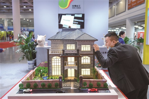 2020年11月6日,2020长沙新材料产业博览会上,市民被建筑上的水包砂新材料所吸引。