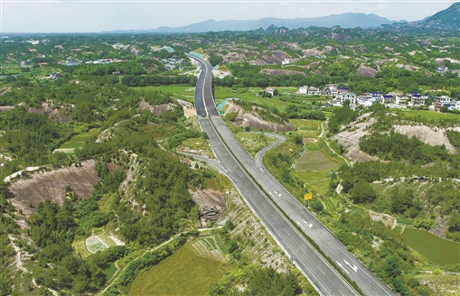 6月27日,平江县石牛寨镇,平益高速路面第一合同段,新铺的路面犹如一条黑色巨龙穿行于丹霞地貌中。平益高速全线将于10月底前完成整体沥青摊铺,年底建成通车。