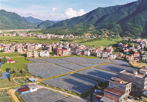 6月28日,蓝山县塔峰镇岭脚村优质葡萄基地,避雨棚与田野、村庄相映成趣。近年,该县发展优质葡萄、香芋、黄花梨等特色“菜篮子”基地7万亩,并推广小棚避雨栽培、滴灌、增施有机肥等技术,产品畅销粤港澳大湾区,有效促进农业增效、农民增收。湖南日报全媒体记者 徐行 通讯员 杨雄春 摄影报道