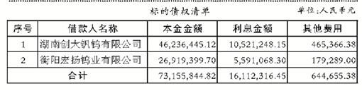本次拟处置的资产为湖南创大钒钨有限公司等2户债权(以下简称“标的债权”)。截至2022年5月25日(处置基准日),标的债权本金余额7,315.58万元,利息及费用余额1,675.70万元,债权总额合计8,991.28万元。