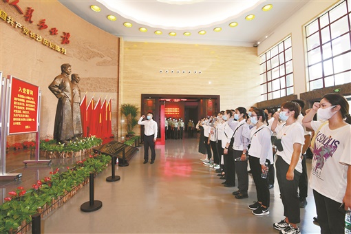 7月1日,中国共产党长沙历史馆,党员们在重温入党誓词。当天,前来该馆参观学习的单位近50家、人数约5000人。最近,长沙红色旅游不断升温。湖南日报全媒体记者 田超 摄