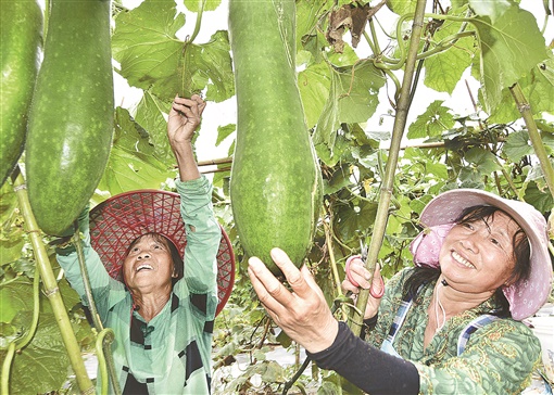 7月3日,嘉禾县龙潭镇龙兴村,村民在蔬菜基地修枝剪叶、护理瓜果。今年,该村建起千亩蔬菜基地,种植冬瓜、玉米、豆角等瓜果蔬菜,所产农产品销往广州、深圳等地,提高了村民经济收入。