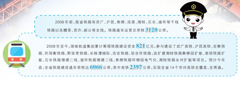 立足主责主业,切实履行铁路等基础设施投融资职责,确保建设资金需求和债务安全。自公司成立以来,湖南轨道集团累计参建铁路项目22个,累计筹措铁路建设资金821亿元。截至“十三五”末,湖南铁路营运里程达到5630公里,高铁营运里程(1986公里)居全国第六位、中部地区第二位。随着6月20日常益长铁路益阳至长沙段正式进入试运行阶段,今年内即将实现14个市州高铁全覆盖、全贯通。