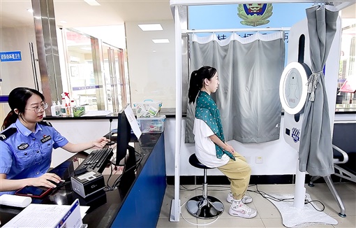 7月7日,长沙市公安局天心分局桂花坪派出所,市民在使用AI证件拍照机拍摄。该拍照机是湖南首台AI证件拍照机,主要用于居民身份证证件照的拍摄,拍摄的照片能快速上传到办证系统。