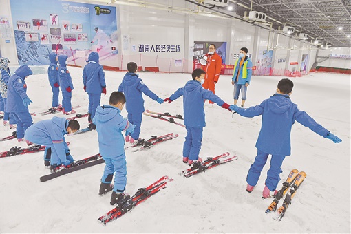 7月11日,长沙三只熊冰雪王国,学生在免费学习滑雪。当天起,长沙市中小学生可免费参加11项体育培训和游泳,活动时长40天。其中,免费开放的游泳场所共23家,免费培训点67个。