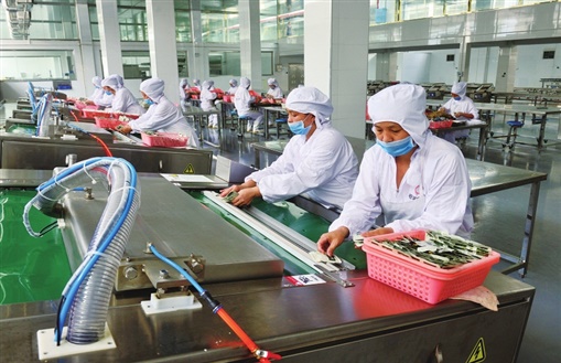 新晃老蔡食品有限责任公司生产车间内,机器轰鸣。160余名工人正在生产加工牛肉,一派繁忙景象。